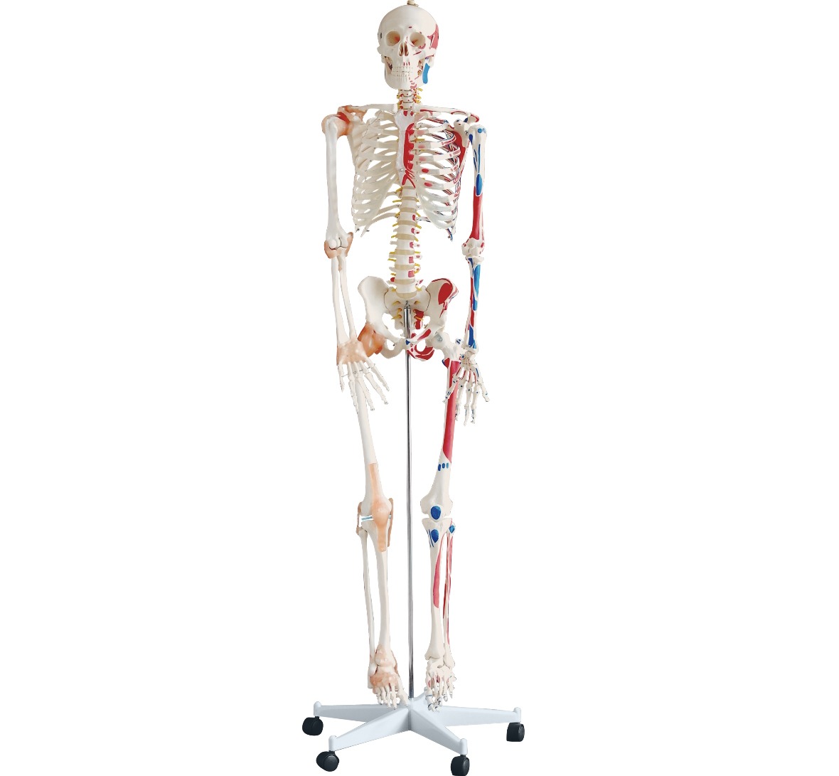 Эта модель, созданная на основе INT-101, окрашена таким образом, чтобы показать мышцы и связки. На левой стороне скелета показаны точки начала (красные) и точки прикрепления (синие) мышц. INT-101AN — это улучшенная версия с пронумерованными обозначениями мышц для легкой идентификации и изучения.